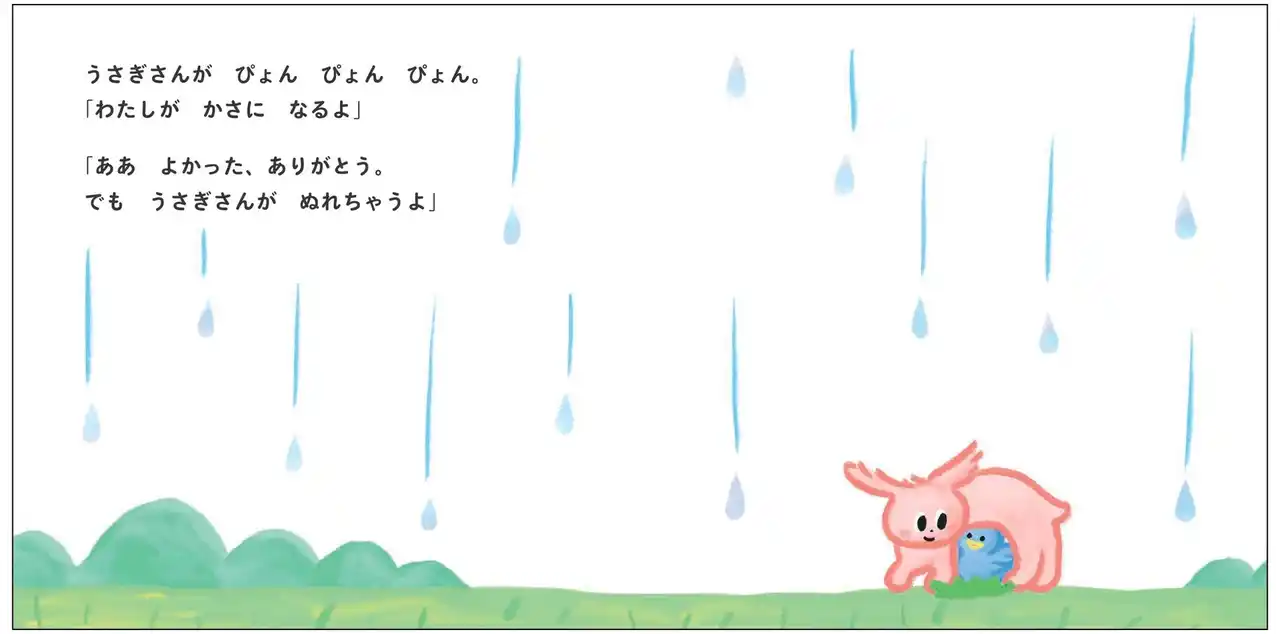 雨の中、とりさんがぬれながら、ぽつんと座っています。そこへ、やってきたのはうさぎさん。「わたしがかさになるよ」と、とりさんの上に重なって雨から守ります。 |