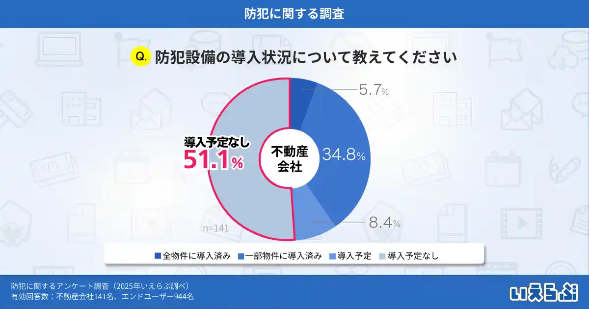 | 不動産業界特化のDX支援サービスを展開する、株式会社いえらぶGROUP(本社:東京都新宿区、代表取締役:岩名泰介、以下「いえらぶGROUP」)は、不動産会社・エンドユーザーに対して「防犯に関するアンケート調査」を実施しました。不動産会社141名、エンドユーザー944名、有効回答1,085件の調査結果を発表します。 | ||||