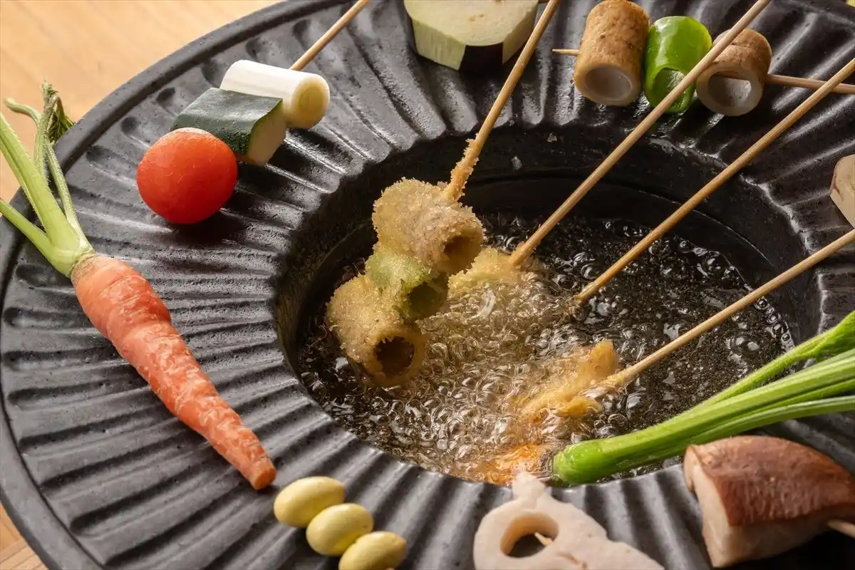 「里山の旬菜 菜種揚げ」は、厳選された地元の旬野菜を、お客様自身のタイミングで揚げていただく体験型メニューです。 |