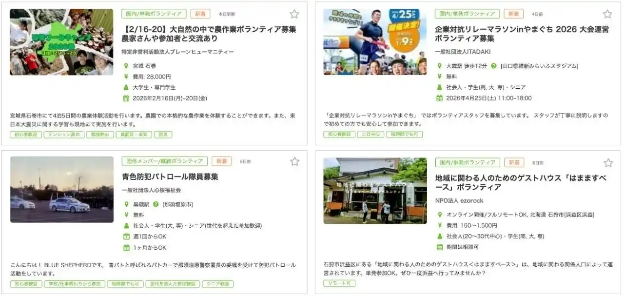 年間約9万件のボランティア応募を実現し、個人には、幅広い社会問題に取り組む団体との出会いを創出することで、"社会貢献”という人生の彩りを。非営利団体には、人材不足の課題解決と関係人口を増やす一助として機能することで、持続可能な非営利活動に貢献しています。 |