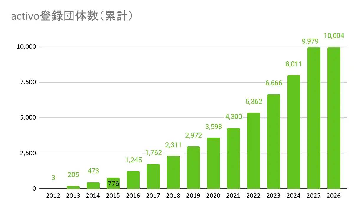 2013年1月に、ボランティアを募りたい非営利団体と、ボランティア活動に参加したい個人をつなぐボランティア募集情報サイト「activo」を公開して以来、activoに登録する非営利団体の登録数は右肩上がりに増加。約10年前と比較(※1)すると12.9倍に増え、2026年1月12日で、登録団体数は1万件を突破いたしました。 |
