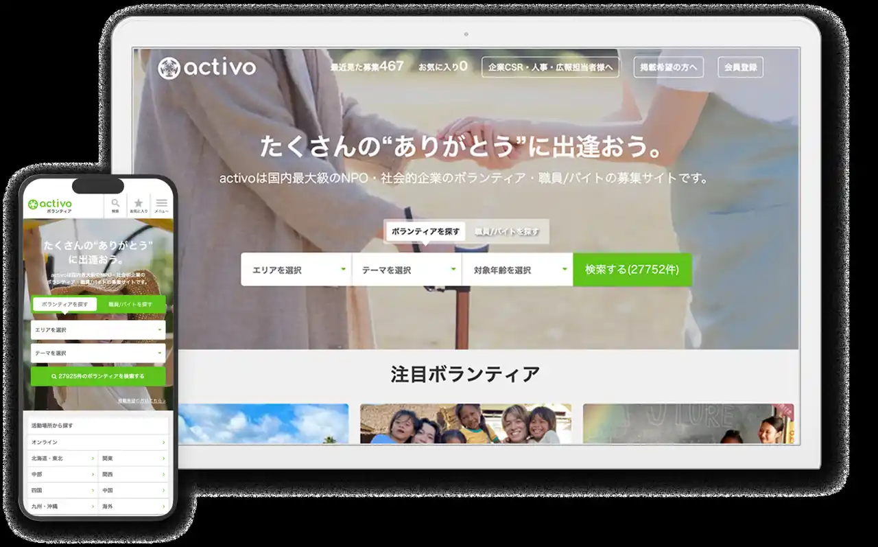 「ボランティアを日常の選択肢へ。つながりを社会の力へ。」をビジョンに掲げ、「人の力を必要としている非営利組織」と、「何か力になりたい個人」をつなぐ国内最大級のボランティア募集情報サイト「activo(アクティボ)」を運営しています。 |