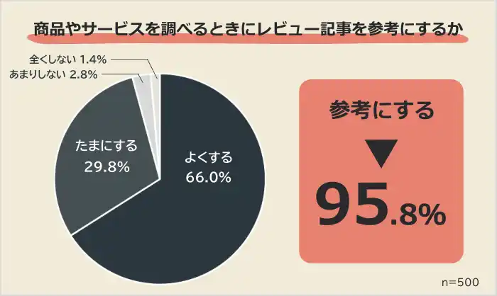 | 株式会社マイスタースタジオの調査によると、商品やサービスを調べる際にレビュー記事を参考にする人は全体の95.8%にものぼり、多くの人が口コミなどのレビューを参考にしていることがわかります。 | |||||||||||