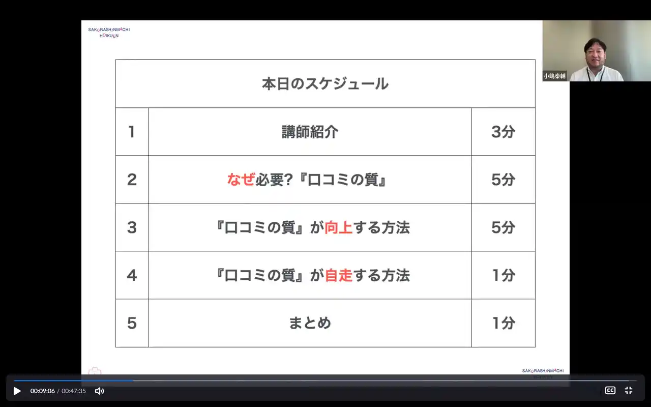 | 前回のセミナーでは、口コミの重要性や保育現場との親和性に加え、さくらしんまち保育園が実践している「口コミの質を高めるための取り組み」について紹介し、多くの反響をいただきました。今回は、その内容を踏まえ、保護者の声を活かした情報発信や、採用や職員定着につなげる具体的な方法について、実例を交えながらより踏み込んで解説します。前回のセミナーを受講された方はもちろん、今回初めて参加される方にも理解を深めていただける内容となっています。 | |||||||||||