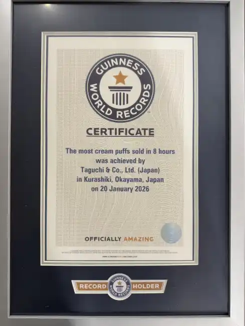 田口食品株式会社(本社:兵庫県たつの市)が展開するスイーツブランド 「オランジェ」 は、 2026年1月20日(火)、岡山県倉敷市の マルナカ新倉敷店 にて実施した ギネス世界記録公式チャレンジにおいて、 「8時間で最も多く売れたシュークリーム」 の記録を達成したことをお知らせいたします。 |