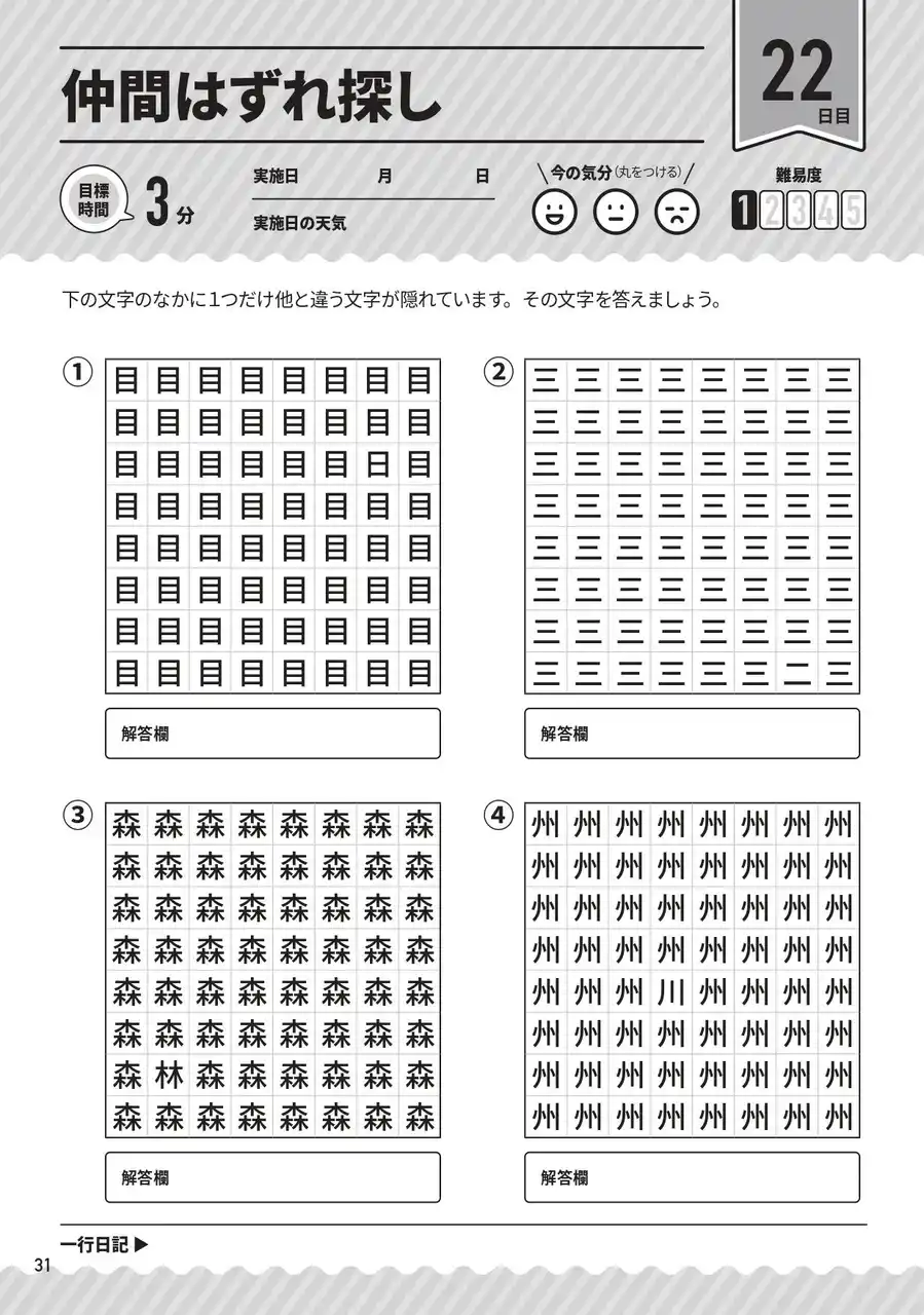 | 問題を解いたあと、日々の出来事や気づいたことを「思い出して書く」ことで、脳を活性化させ老化を防ぐことができます。 | ||||||||||||
