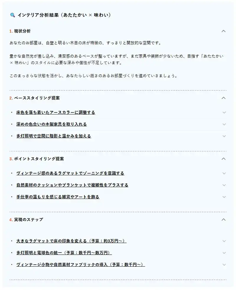 お部屋の写真を撮影し、好みのスタイルを選ぶだけ。セオリーに則って、AIが「提案画像」と「提案理由」を生成します。 |