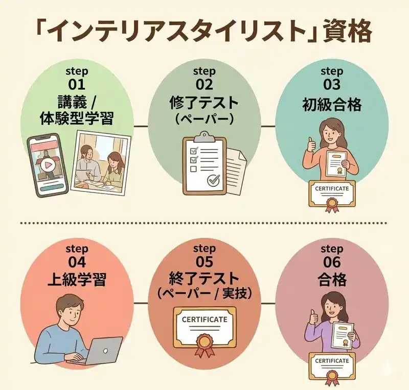 今秋頃を目途に、学んだスキルを証明する民間資格「インテリアスタイリスト」の新設を予定しています。趣味として楽しみたい方向けの「初級」から、プロを目指す「上級」まで、段階的なカリキュラムを構想中。 |