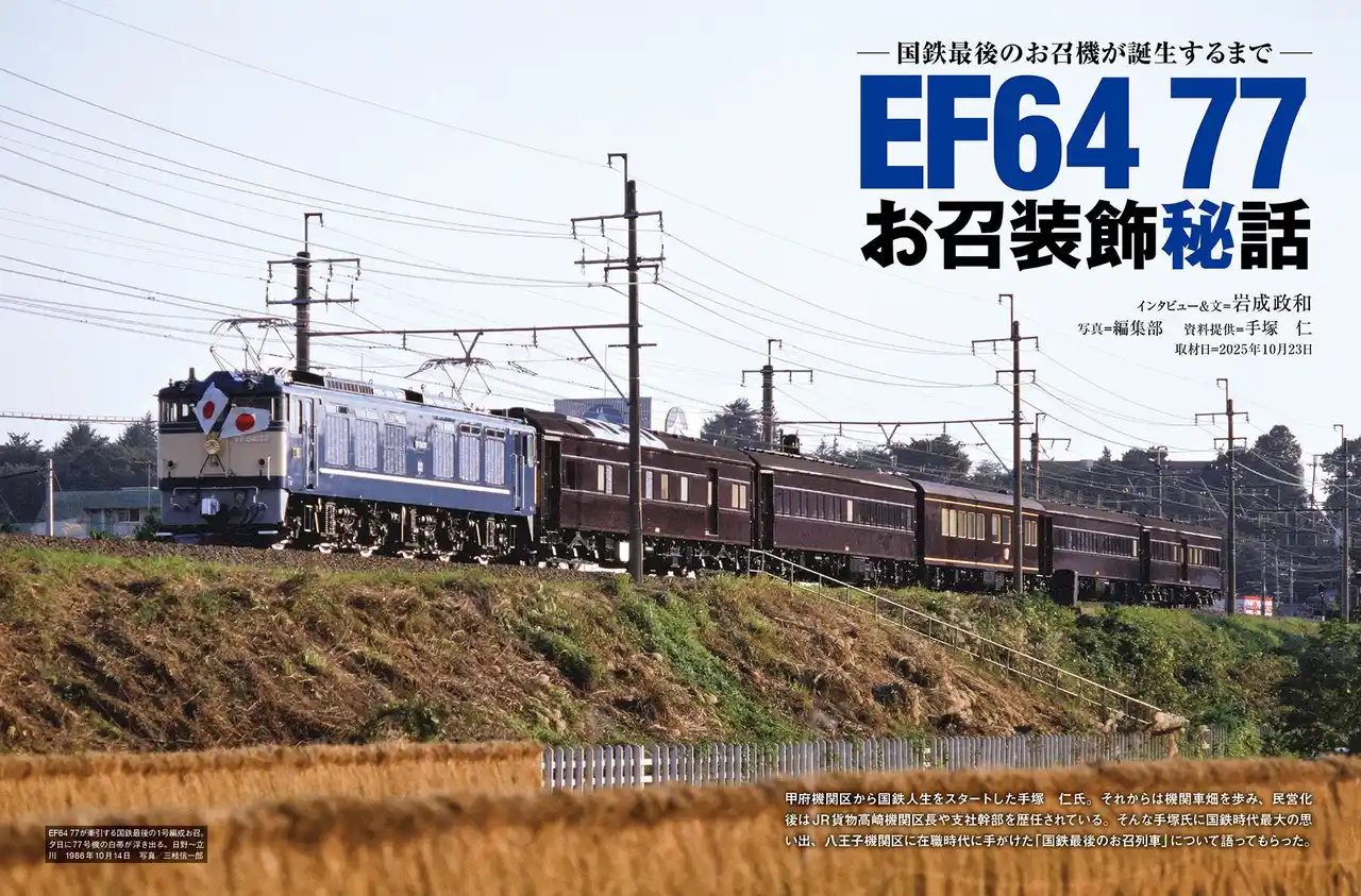 特集ではこのステンレス帯の製造図面をJR関係者から提供を受け本邦初公開。図面からいまもなお人気を誇るお召機EF58 60・61(61号機は大宮鉄道博物館収蔵展示中)の魅力を解説。この帯のデザインはその後のお召列車牽引機にも影響し、1985年「つくば博覧会」開催の際に常磐線などで運転されたEF81 81、1986年の「山梨国体」開催の際に中央本線で運転されたEF64 77の両貨物牽引機にも帯が追加され、一線を画す存在となった。この2両がどうして貨物機からお召機に選定されたかなど、当時のお召列車運転に携わった国鉄本社運転局と八王子機関区の担当者にインタビュー、知られざる舞台裏を解説。さらにEF64 77に関しては、お召列車の乗務員が実際の運転台に掲出した運転時刻表と機関車の装飾品などを誌面で初披露する。 |