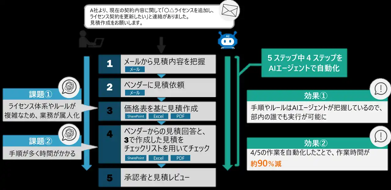 | 日立ソリューションズは、特定のサービスのライセンス販売における見積書の作成業務に本ソリューションを適用し、作業工程の約80%の自動化と、担当者の作業時間の約90%削減を成功しました。担当者がメールの内容から顧客要件を把握し、価格表をもとに手作業で算出し、チェックリストに沿った確認を行うという一連の見積作成業務を、AIエージェントで完全自動化しました。AIエージェントが担当者と対話しながら、必要なクラウドサービスを選択、データを取得し、見積書作成後に担当者へ確認を依頼、さらにライセンス販売元ベンダーへの連絡や調整までを自動で行います。 | |||