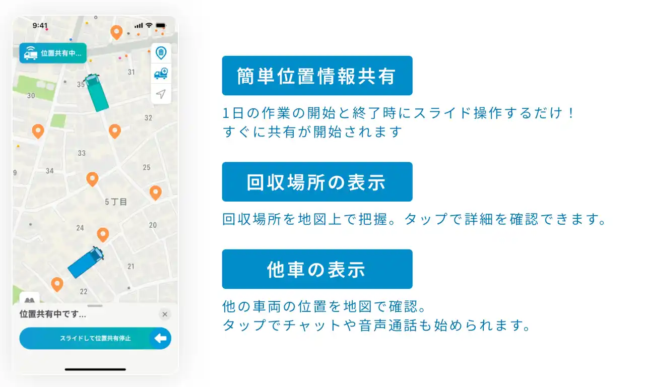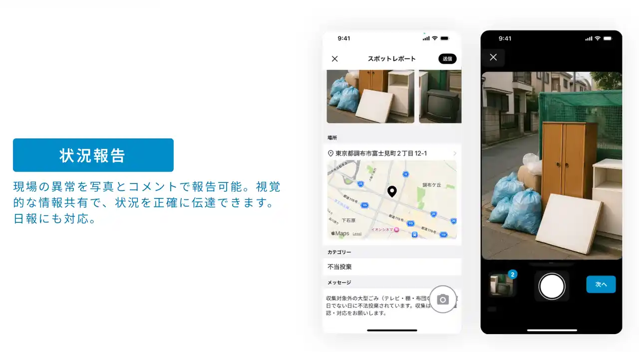ごみ収集現場の状況を「見える化」し業務の効率化につなげる、自治体・収集事業者向けのクラウドサービスです。 収集車両の現在地をリアルタイムで把握できるほか、集積所の汚れや違反ごみ、回収量などの現場状況を、写真と位置情報付きで簡単に報告・記録できます。 管理画面では、全車両の動きと現場報告を地図上で一元管理できます。日々の進捗確認や業務改善はもちろん、災害時やトラブル発生時にも状況を即座に把握し、的確な指示が可能です。 |