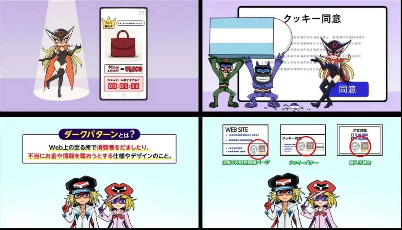 このたび当協会では、1. 株式会社フォーラムエイトによるNDD(Non-Deceptive Design)認定第1号取得 2.タツノコプロ制作の人気アニメ『タイムボカンシリーズ ヤッターマン』から、ヤッターマン、ドロンジョを起用した「ダークパターン啓発動画」の初公開 3. 消費者庁・文部科学省のレビューを経て制作した「ダークパターン啓発動画」の学校教育現場での初活用を通じ、ダークパターン対策を“社会インフラ”として定着させるフェーズへと本格的に移行しました。 |