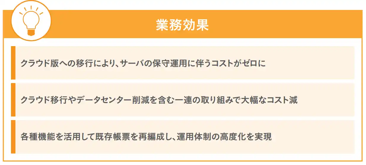 また、15年近く運用していたオンプレミス版から移行したことで、サーバの維持管理にかかるコストがゼロになり、データセンターの削減とあわせて大幅な経費節減を実現しました。 |