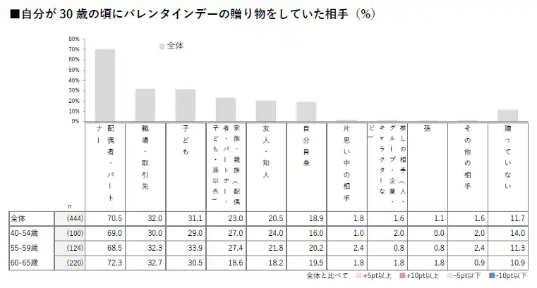 全国の40~65歳女性に「自分が30歳の頃にバレンタインデーの贈り物をしていた相手」と「次回(2026年)にバレンタインの贈り物をする予定の相手」について尋ねたところ、「職場・取引先」と回答した人は32%から9%へと数字が大きく減少した。 |
