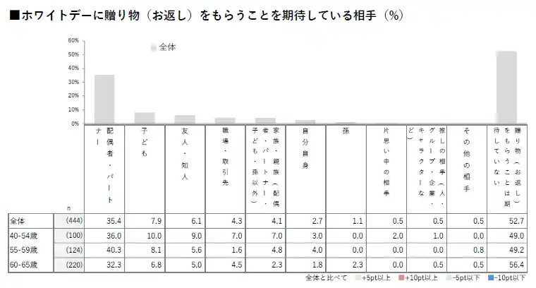 「次回(2026年)のホワイトデーに贈り物(お返し)をもらうことを期待している相手」について尋ねたところ、「贈り物(お返し)をもらうことは期待していない」と回答した人が52.7%と過半数を占めた。次点は「配偶者・パートナー(35.4%)」だった。 |