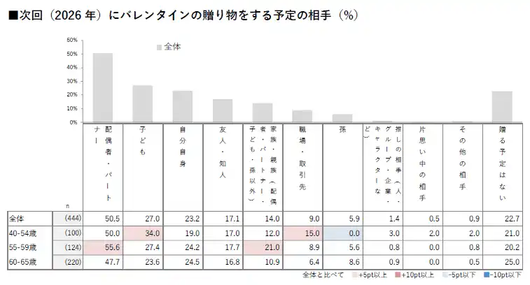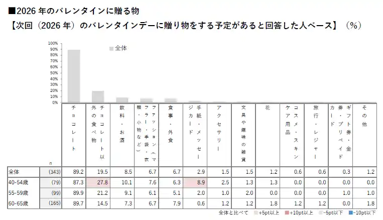 40~54歳では「チョコレート以外の食べ物(27.8%)」が他の世代に比べ高い。定番が主流の中、若年層ほど楽しみ方に広がりが見られる。 |