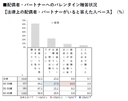 ■かつて一般的だった “職場の義理チョコ” は32%から9%へと大きく縮小。一方で、毎年配偶者・パートナーへ贈り物をしている人は62.1%と、身近な家族への愛情や感謝を伝える機会としてのバレンタインデーの役割は継続 |