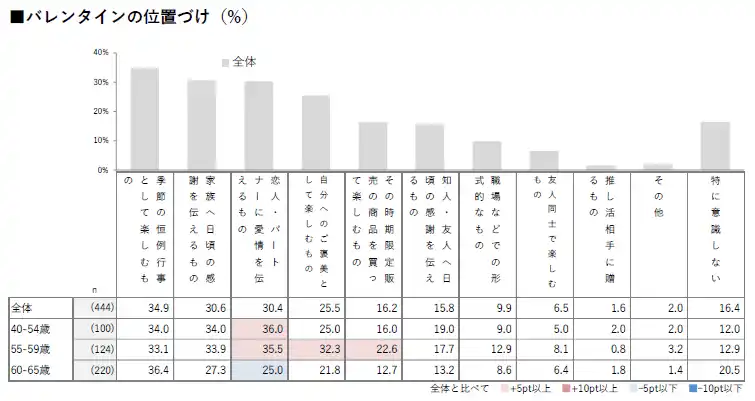 ■55~59歳では「自分へのご褒美として楽しむもの(32.3%)」「その時期限定販売の商品を買って楽しむもの(22.6%)」が他の世代より高く、バレンタインを“自分のためのイベント”として捉える傾向が見られた |