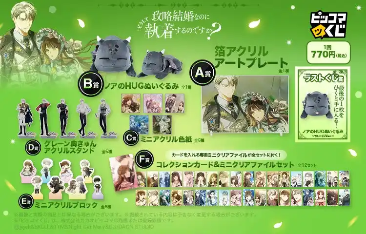 F賞:コレクションカード&ミニクリアファイルセット(全12種) ラストくじ賞:ノアのHUGぬいぐるみ~ラストくじver.~(全1種) |