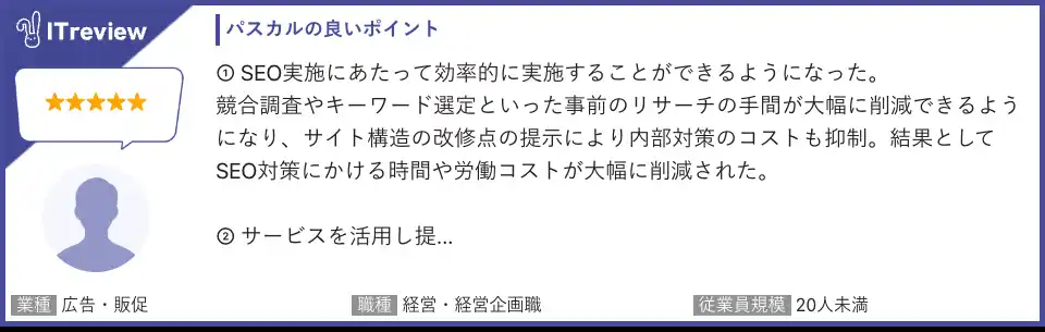 | ITreviewにて、実際にパスカルをご利用いただいているお客様よりたくさんのお声をいただいております。 | |||