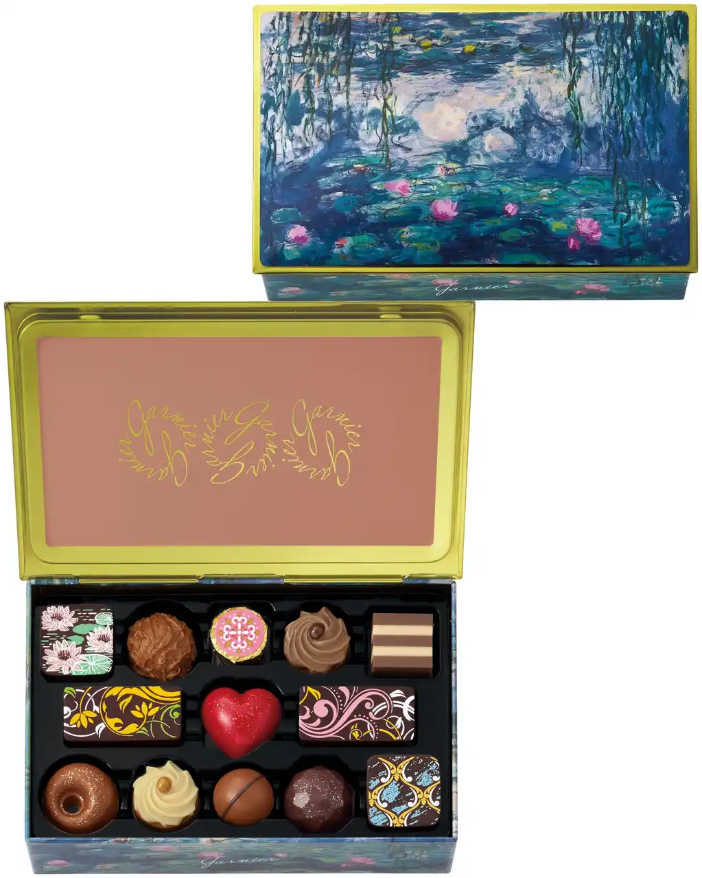 クロード・モネ「睡蓮」の絵画パッケージに、ひとつひとつ丁寧に仕上げたチョコレートを詰め合わせました。 |