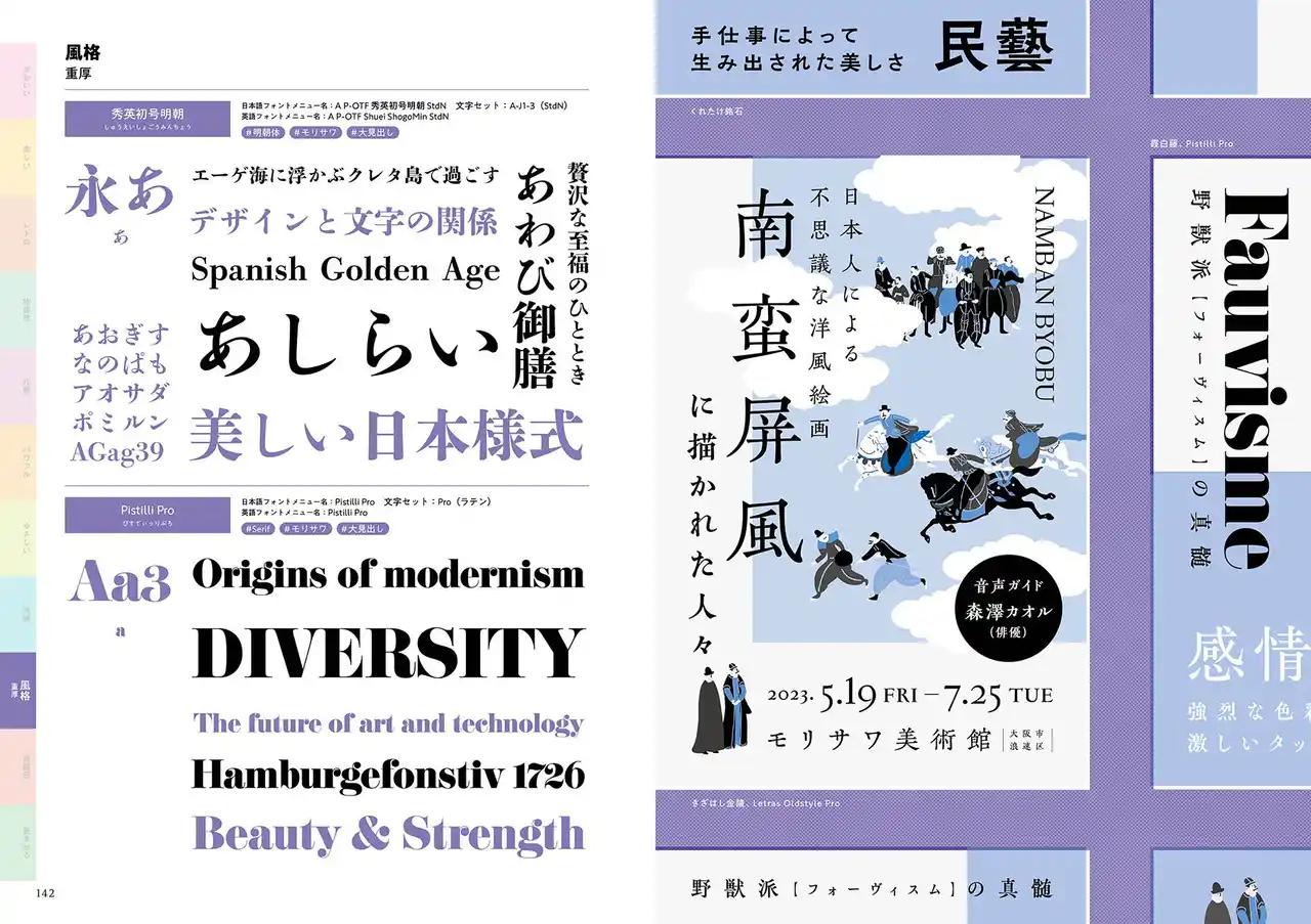 | 本書では、モリサワの書体一覧を「表現・特徴・全書体見本」という3つのカテゴリから探すことができます。これにより制作物に最適な書体を、3,500種類以上のMorisawa Fontsライブラリから直感的に選択することが可能です。 | |||||||||||||||