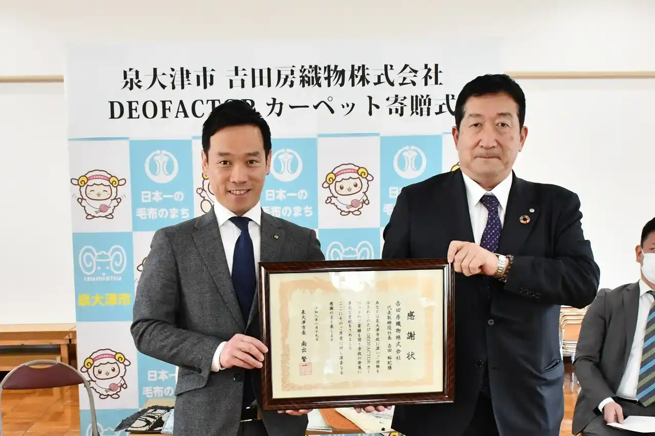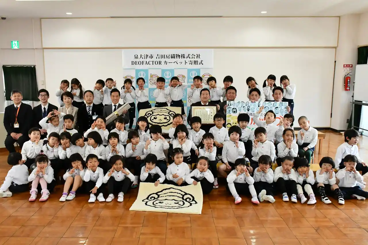 大阪府泉大津市(市長:南出賢一)は、地元繊維企業である吉田房織物株式会社(泉大津市、代表取締役社長:吉田裕紀、以下「吉田房織物」)から、高機能なDEOFACTOR(デオファクター)カーペットの寄贈を受け、市立旭幼稚園において寄贈式を開催しました。 |
