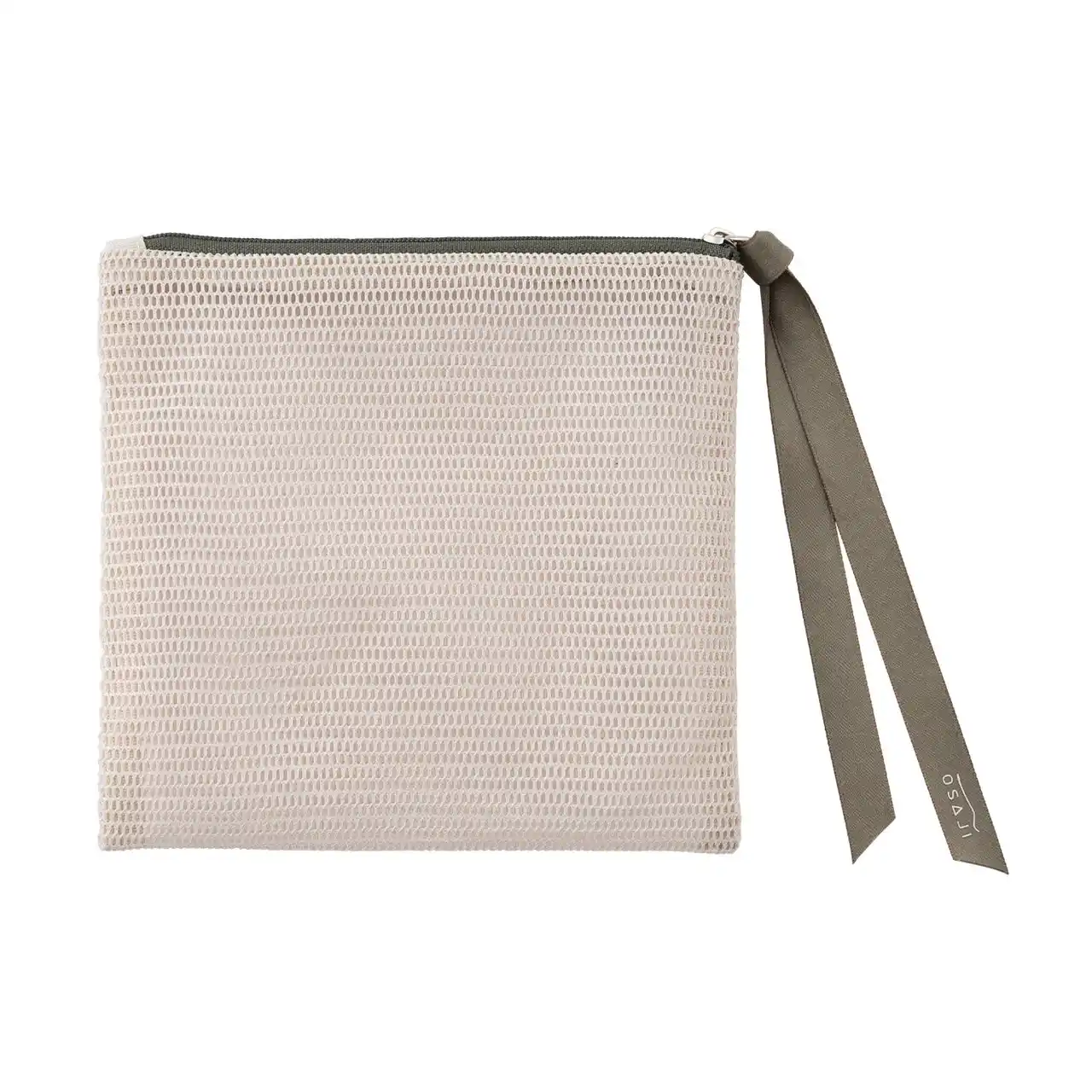 軽やかな透け感のあるメッシュ素材を使用したポーチに、OSAJIロゴをあしらったリボンを添えたポーチ。 |