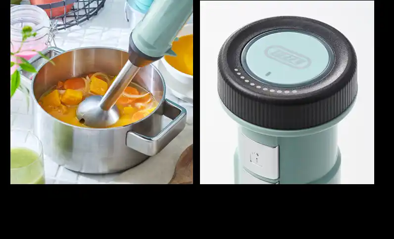 1台で「つぶす」 「まぜる」の2役を使い分けることができ、いつもの料理をスピーディーに、手のかかる料理も簡単に作れます。また、本体上部にあるスピード調節ダイヤルで、無段階で回転スピード調整が可能。食材に合わせてスピードを変えられます。金属製のボウル・お鍋などに直接使用できるので、洗い物も最小限に!料理の下ごしらえから、スムージーや離乳食、お鍋で仕上げる本格ポタージュまで、料理の幅がぐんと広がります。 |