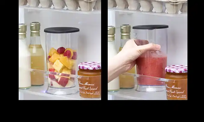 誤作動防止のため、ロック解除ボタンと運転ボタンの2段階操作による安全設計を採用しており、安心してご使用いただけます。さらに、本体とブレンダーをセットできるUSB充電スタンドと、目盛り付きの専用カップが付属。専用カップは蓋付きなので、準備しておいた食材や調理後もそのまま冷蔵庫で保存することができ、調理以外にも便利に活用できます。また、専用カップに水と洗剤を入れて数秒攪拌すれば、刃に触れず手早く洗うことができ、お手入れもラクラク! |