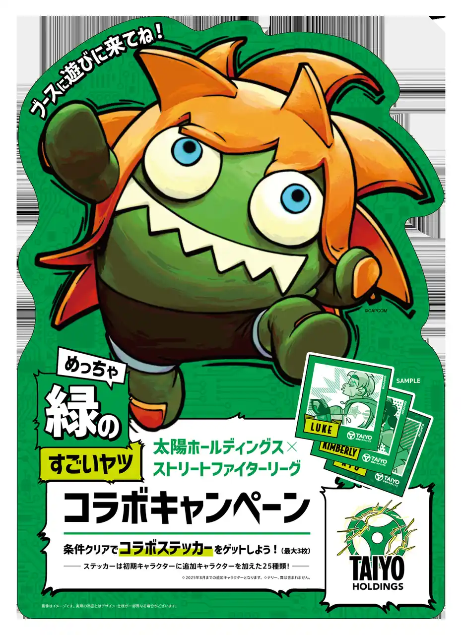ブースでは、『ストリートファイター6』コラボステッカーを数量限定で初めて配布します。『ストリートファイター6』コラボステッカーは、太陽ホールディングスのコーポレートカラーである緑で統一した限定デザインになっており、全部で25種のキャラクターステッカーを用意しています。本ステッカーはミッションの達成に応じて配布します。ミッションは全部で3つあり、全てクリアすることで、おひとり様最大3枚のコラボステッカーを無料で取得することができます。また、『ストリートファイター6』とコラボした太陽ホールディングスの会社案内パンフレットも数量限定で配布します。ぜひ、お越しください。 |
