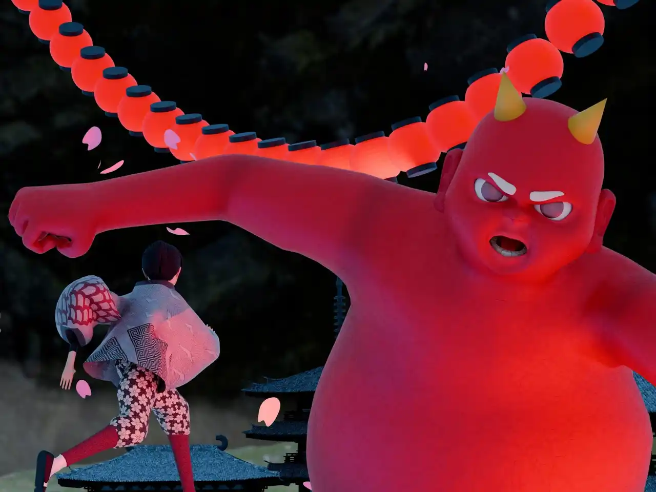 別府の温泉や自然、鬼伝承をテーマに、杉乃井ホテルと学生が共に練り上げたプロジェクションマッピング作品です。オリジナルキャラクター「ゆげまる」の案内により、鬼が守護の存在へと変わっていく物語が、建物の立体感と重なり合いながら3DCGで描かれています。学生たちは声優にも挑戦し、ヒアリングや映像表現の試行錯誤を重ねた創意工夫が、地域の魅力を温かく楽しく伝える作品となっています。 |