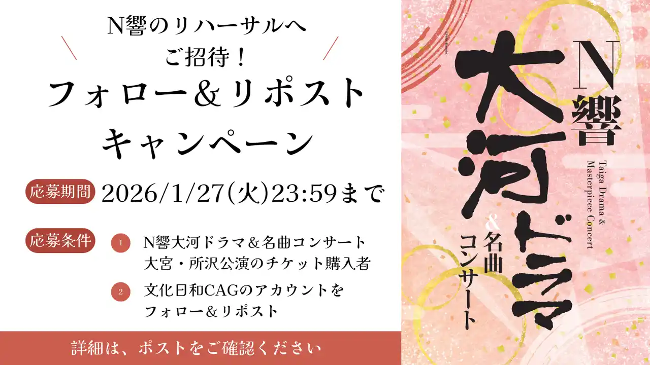 「N響大河ドラマ&名曲コンサート」の当日リハーサル見学の実施に際して、フォロー&リポストキャンペーンを開催中です。 |