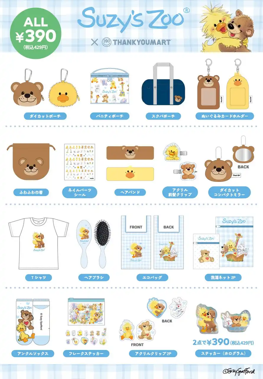 「Be Smile, Be Kawaii」をテーマに、キャラクターの限定アイテムを中心としたカワイイ推しグッズがいつ来てもALL390円で手に入るショップ「サンキューマート」(エルソニック株式会社)は、世界各国で愛される『スージー・ズー』とのコラボレーション雑貨を、全国のサンキューマート店舗で2月中旬より入荷次第販売開始いたします。 |