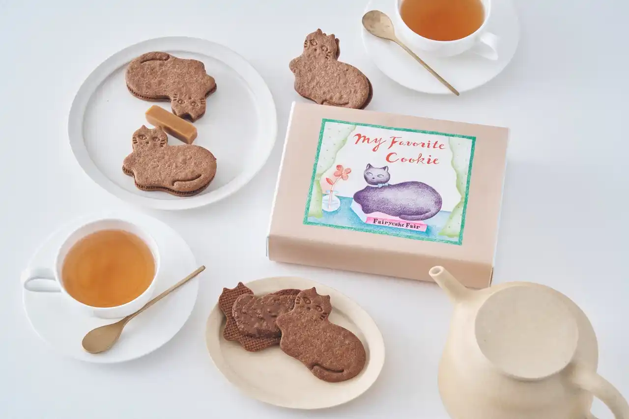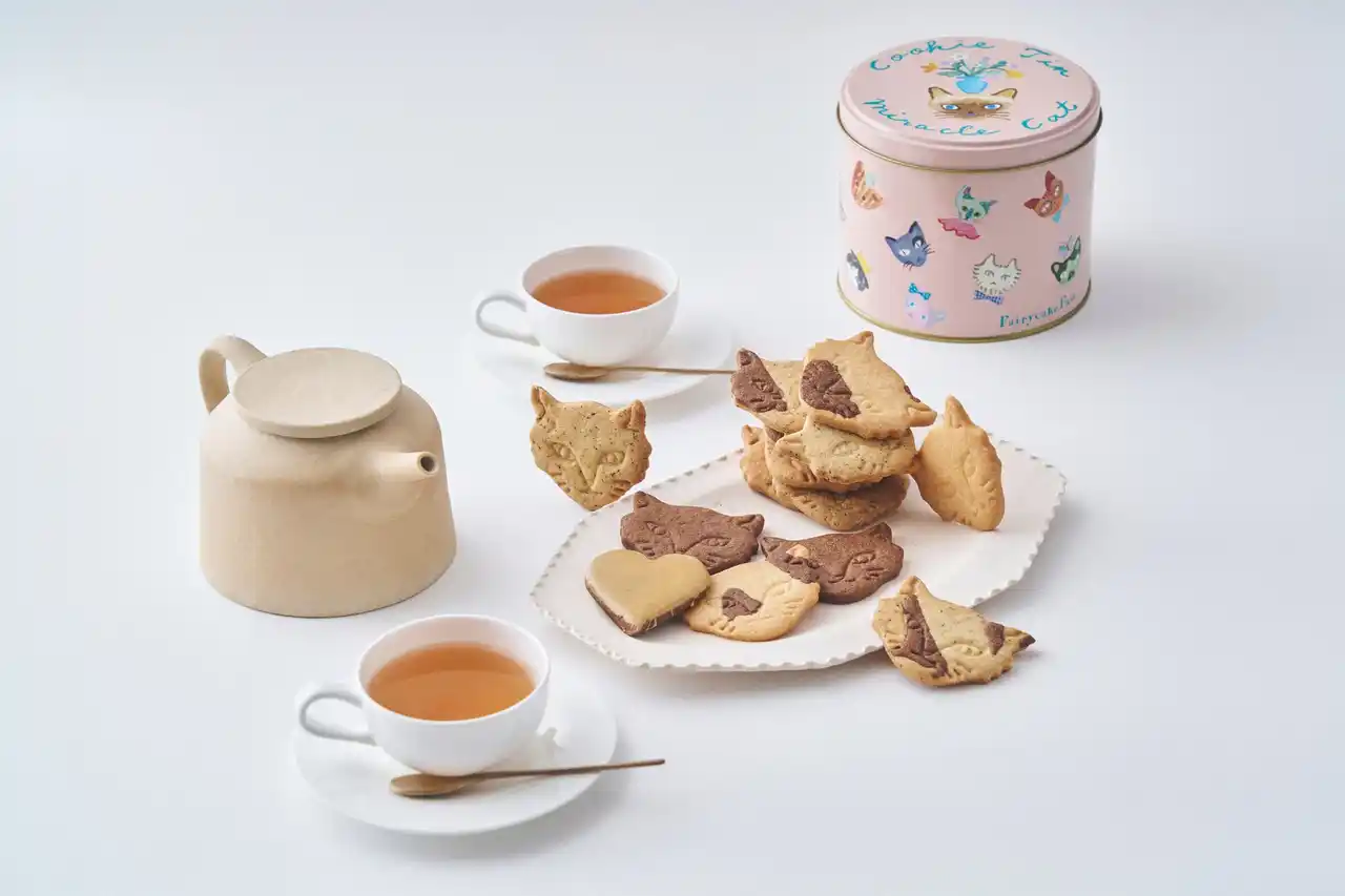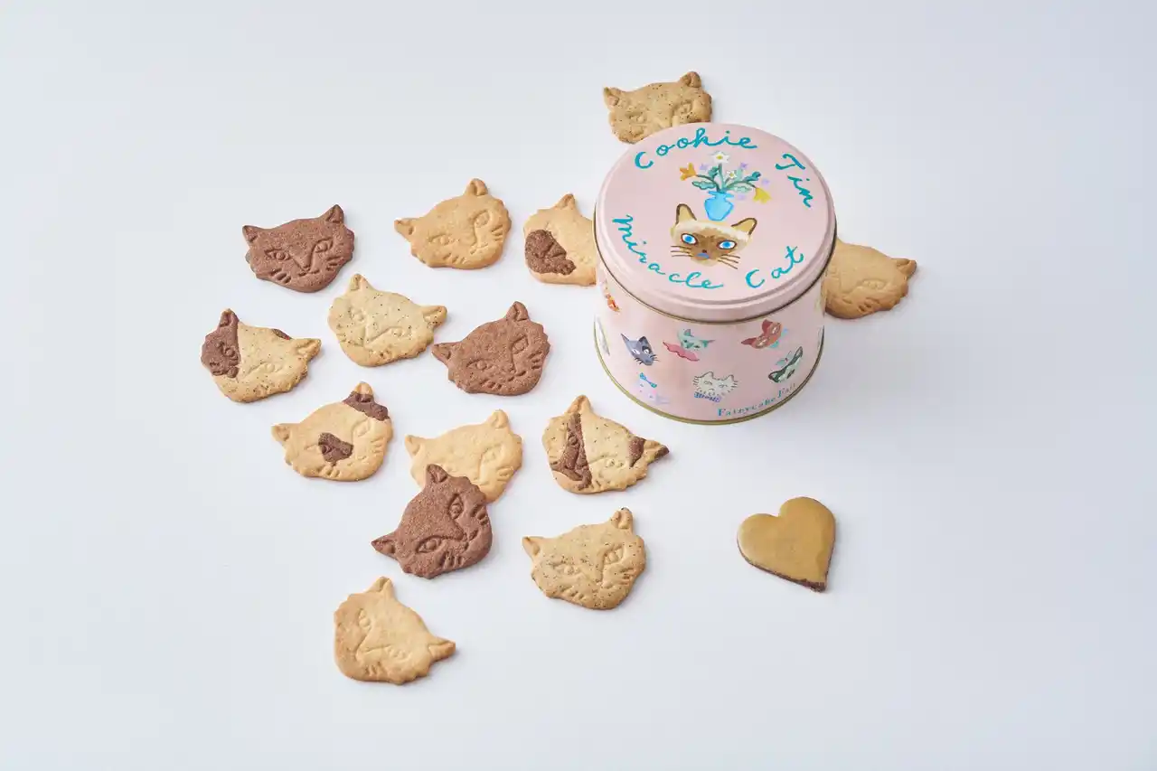 「Miracle Cat Cookie Tin(“神様のいたずら”ネコクッキー缶)」は、“神様のいたずら”のような、不思議な模様やユニークな特徴をもつミラクルキャットたちの愛おしさを伝えたくてうまれたお菓子。ミュージシャン・坂本美雨さん、イラストレーター・前田ひさえさん、フェアリーケーキフェアとの共同制作によって2021年にデビューした大人気のネコクッキー缶です。 |