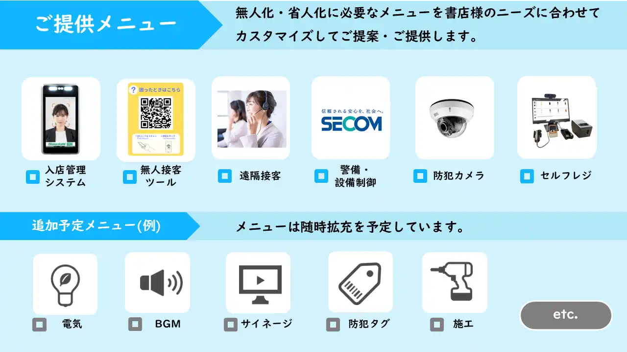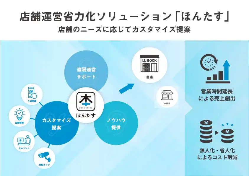 店舗運営省力化ソリューション「ほんたす」は、営業時間延長による売上創出や、無人化・省人化によるコスト削減を実現する、日販が提供するサービスです。<完全無人化><有人・無人のハイブリッド化><有人運営時間の省人化><24時間営業化>など、希望する運営形態や規模・予算など店舗ごとのニーズに応じて、「入店管理システム」「無人接客ツール」「遠隔接客サービス」「警備・設備制御」など、複数メニューを自由に組み合わせて導入できるソリューションとして提供されています。 |