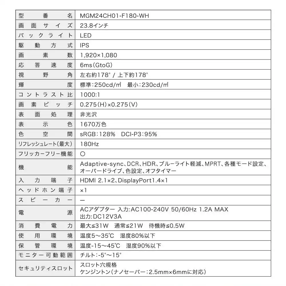 ジェネリック家電ブランド「MAXZEN」を展開するマクスゼン株式会社(本社:東京都江東区、代表取締役社長:清水敏光)は、ゲーミングモニター(MGM24CH01-F180-WH)を、2025年12月25日より発売します。 |