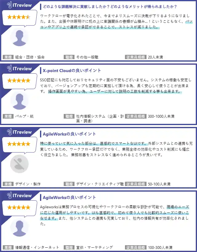 直感的に操作できる画面等からくる現場への定着のしやすさなどをご評価いただき、高い満足度につながりました。これまでにユーザーの皆さまから投稿いただいたレビューの一部をご紹介いたします。 |