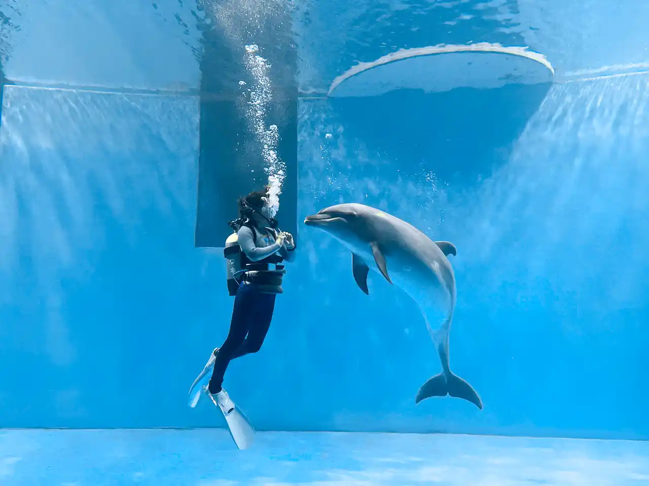 冬期限定の水中ドルフィンパフォーマンス「Art of Dolphin」は、バンドウイルカとトレーナーとが水中で織りなす優雅な泳ぎが魅力のパフォ―マンスです。陽の光に照らされたバンドウイルカの「美しさ」と「躍動感」が詰まった癒しの時間をお楽しみいただけます。 |