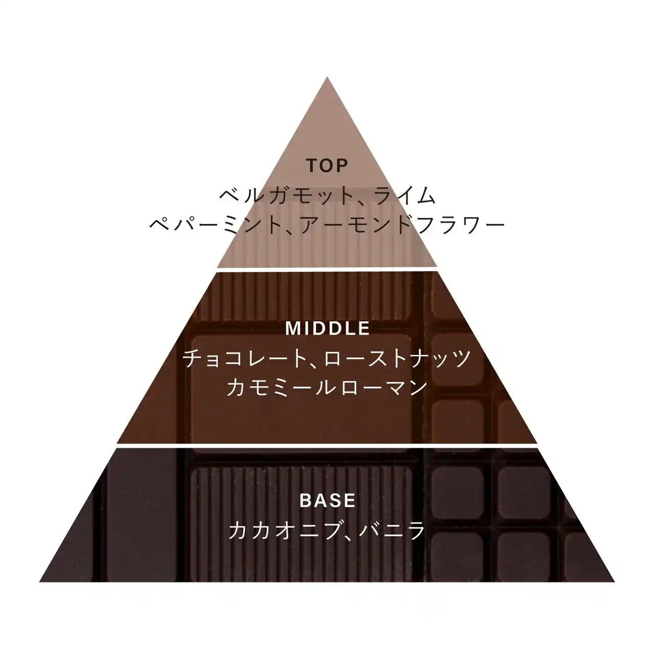ほろ苦いチョコレートの香りを軸に、りんごを思わせるカモミールのニュアンスと、ライムやベルガモットの爽やかさ、ペパーミントのアクセントを重ねた、甘く余韻のある香り。 |