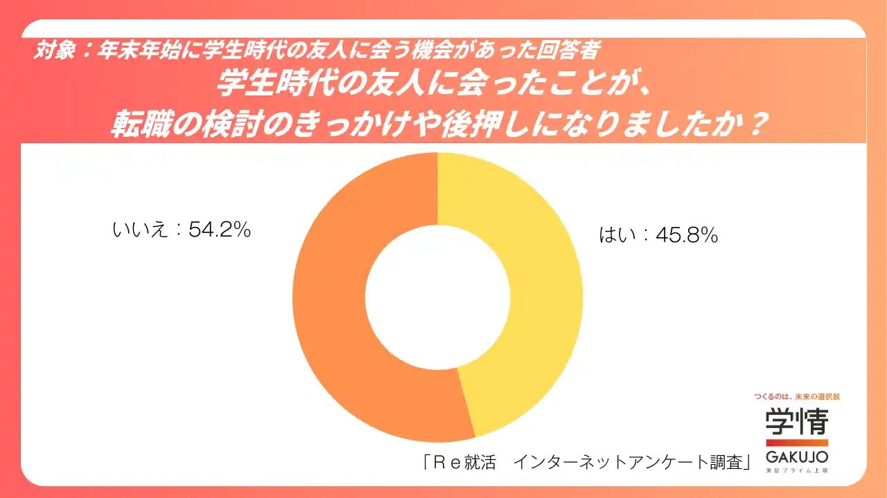 年末年始に学生時代の友人と会った人のうち、45.8%が「転職の検討のきっかけや後押しになった」と回答しました。一方、「影響はなかった」と回答した人は54.2%でした。 |
