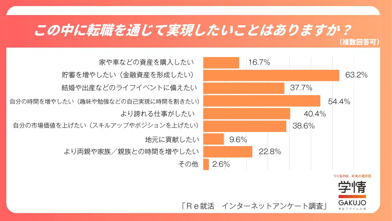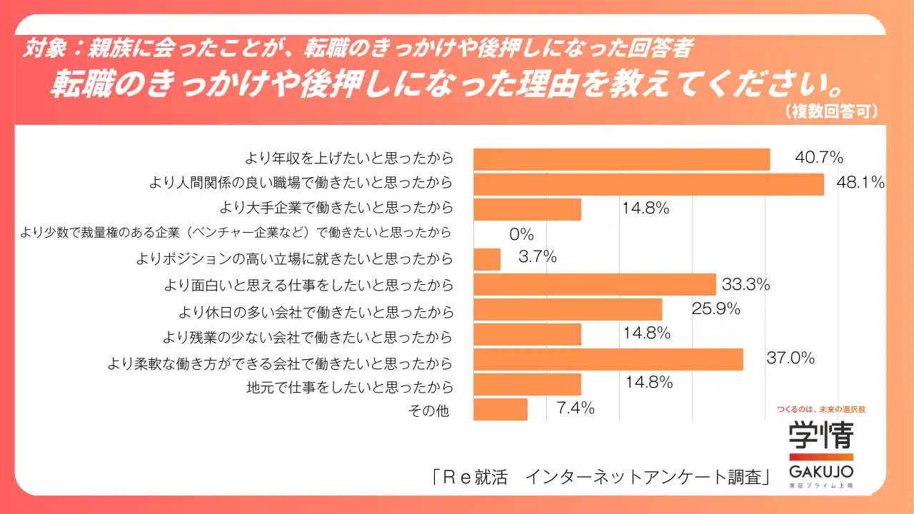 株式会社学情は、20代の求職者を対象に「年末年始の帰省と転職」をテーマとしたインターネットアンケートを実施しました。調査の結果、学生時代の友人と年末年始に会った人のうち45.8%が「転職の検討のきっかけや後押しになった」と回答しました。一方、親族と会ったことが転職意識に影響した人は28.7%にとどまりました。また、転職を通じて実現したいこととしては、「貯蓄を増やしたい」「自分の時間を増やしたい」といった回答が上位となりました。 |