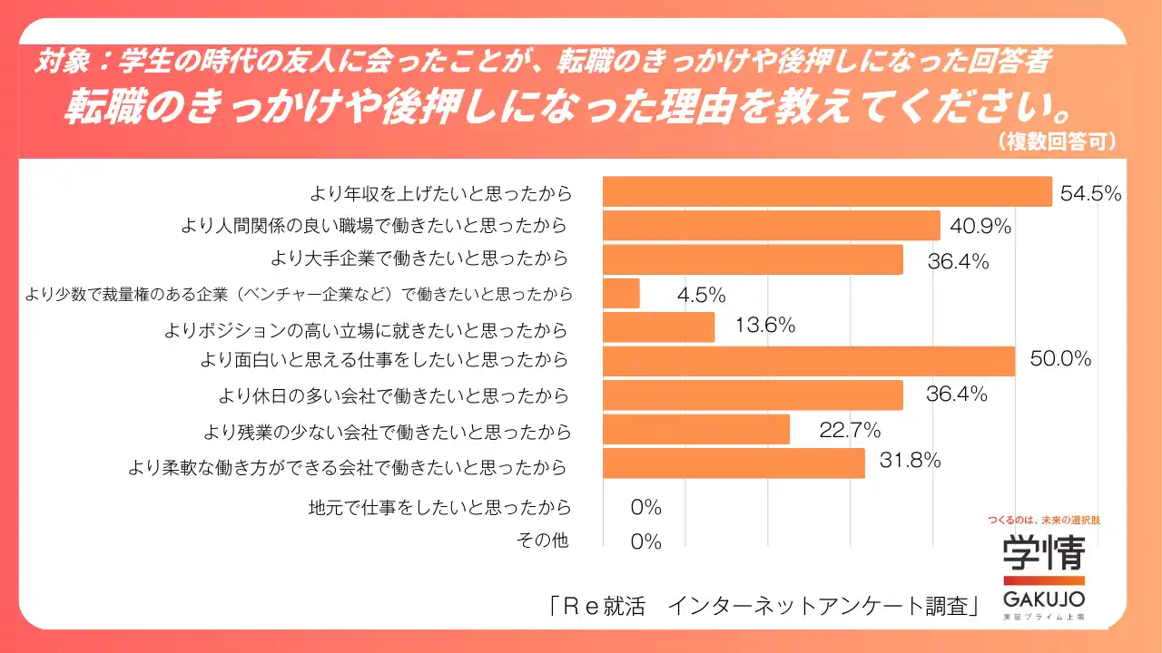 転職のきっかけや後押しになった理由として、最も多かったのは「より年収を上げたいと思ったから」(54.5%)でした。次いで、「より面白いと思える仕事をしたいと思ったから」(50.0%)、「より人間関係の良い職場で働きたいと思ったから」(40.9%)が続きました。 |