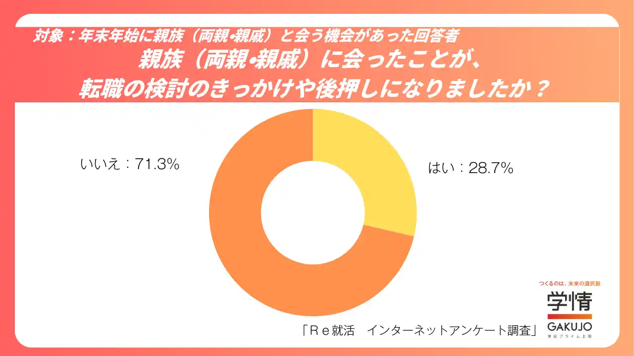 年末年始に親族と会った人のうち、「転職の検討のきっかけや後押しになった」と回答したのは28.7%にとどまりました。 |