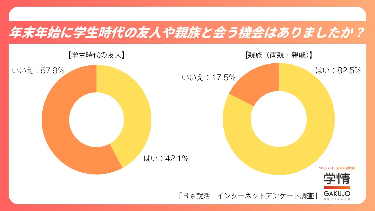 また学生時代の友人と会う機会があった人42.1%、年末年始に親族(両親・親戚)と会う機会があった人は82.5%でした。 |