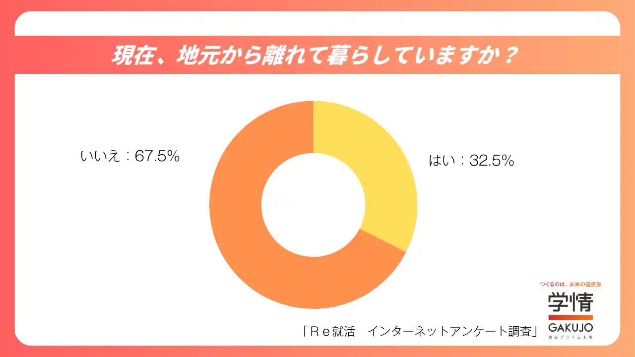 現在、地元から離れて暮らしていると回答した人は32.5%でした。そのうち、今回の年末年始に地元や実家へ帰省した人は67.4%となっています。一方、全体の67.5%は地元で生活していると回答しました。 |
