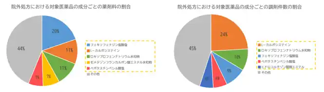| まず、対象医薬品の院外処方における薬剤料と調剤件数の割合について調査しました。 | |||