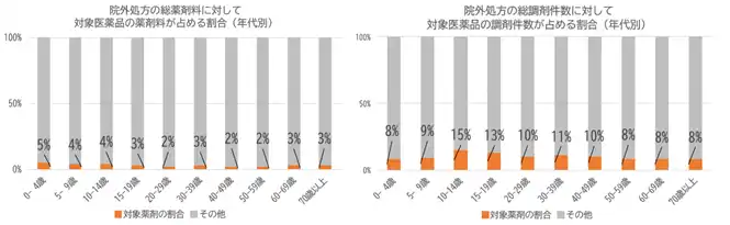 | スイッチOTCと同じ成分の医療用医薬品の処方状況を分析した結果、2024年度において、薬剤料と調剤件数ともに年代ごとの偏りは少なく、薬剤料で全体の約3%、調剤件数で10%を占めていること、また、薬剤料及び調剤件数の分布において、特定の成分に使用が集中している傾向が確認されました。 | |||
