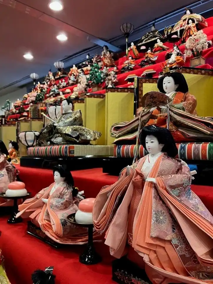 ロビー側に14段の立体展示を含む、計7セットの雛飾りを展示。 間近で楽しめる構成で、ひな人形一体一体の表情を堪能できます。 |