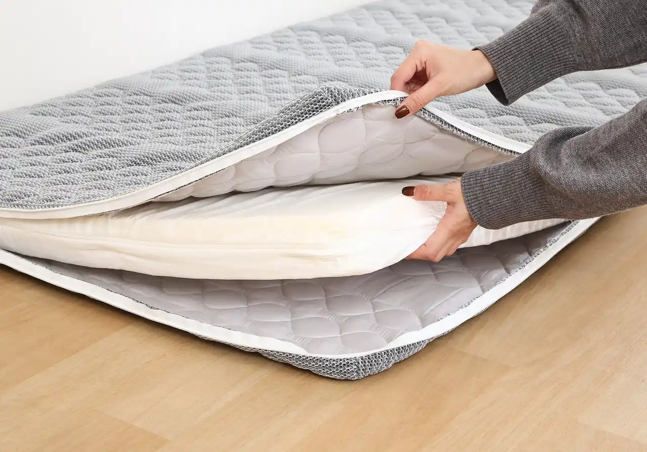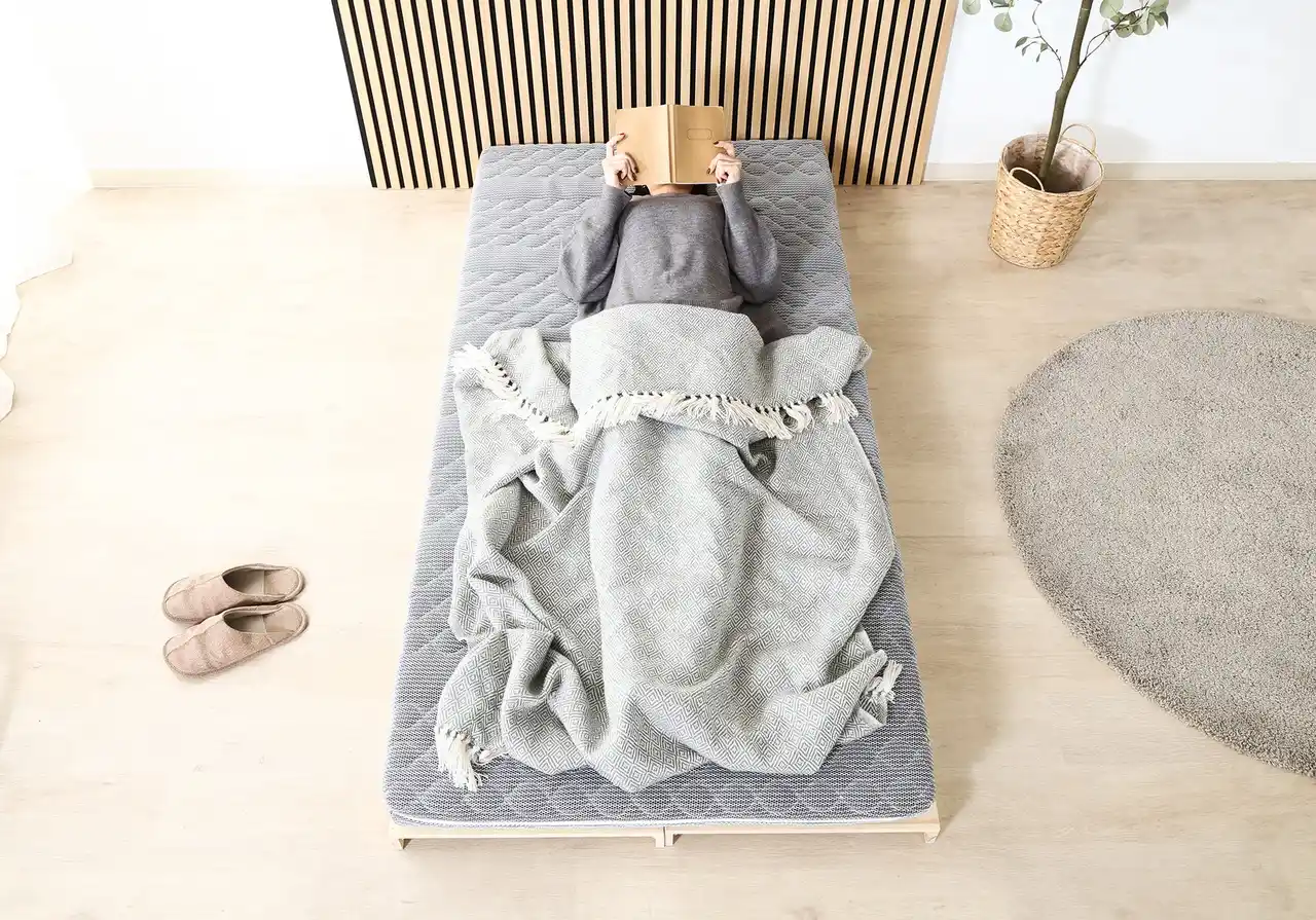 ポリエチレンとウレタンの2層構造を採用し、硬め・柔らかめを気分や体調に合わせて使い分け可能。軽量ながらも体をしっかり受け止める設計です。厚みは約10cmの薄型仕様ながら、構造を工夫することで底付き感を抑え、フローリングに直接敷いても安心感のある寝心地を叶えます。 |